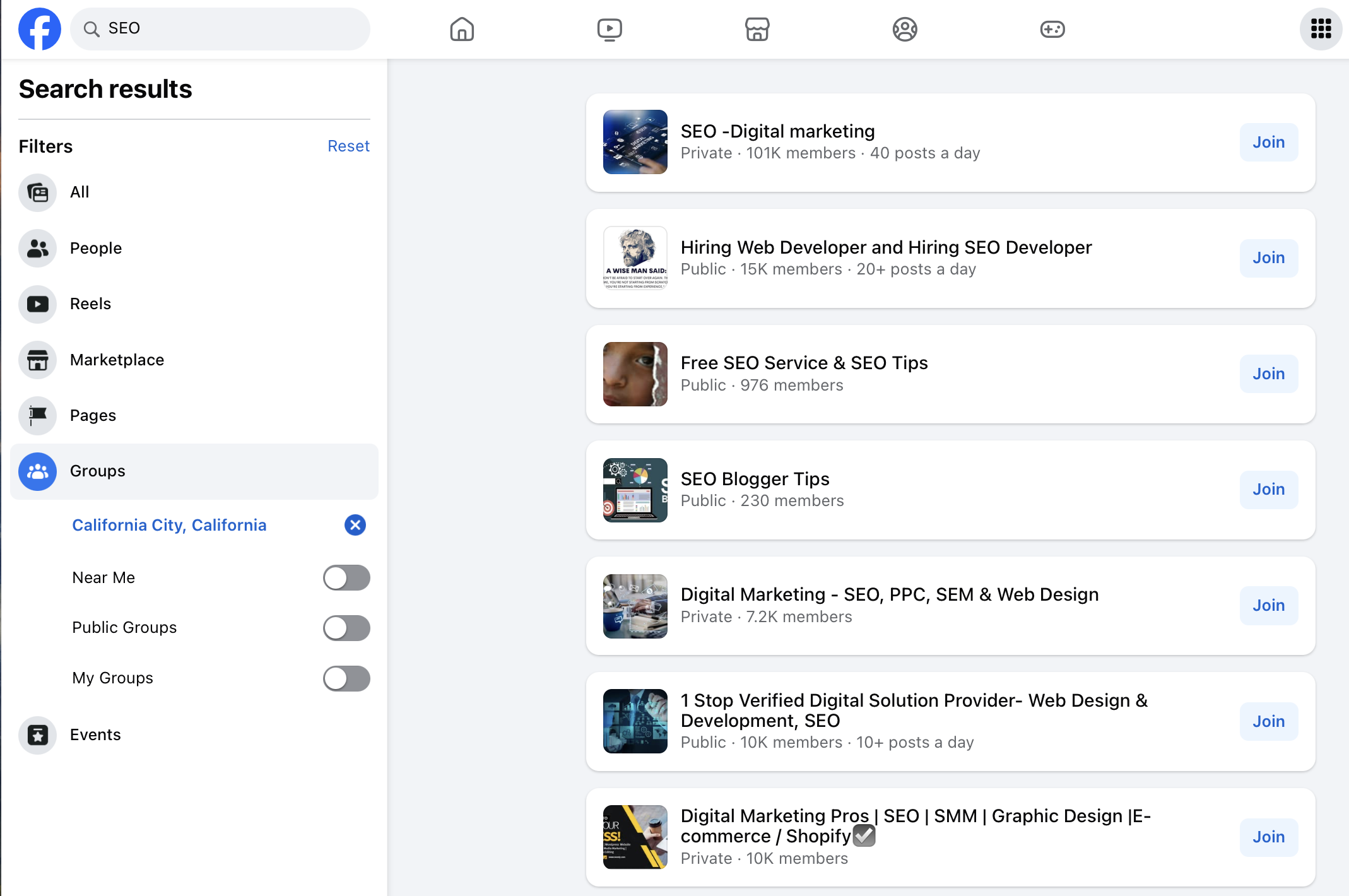 Facebook може слугувати чудовою, менш офіційною альтернативою LinkedIn, особливо групам Facebook, які залишаються популярними для професійного спілкування. Ви можете додати ключові слова, пов’язані з вашим інтересом або галуззю, у Facebook, а потім клацнути у групах і фільтрувати результати відповідно до вашого місцезнаходження.