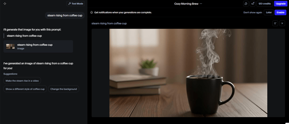 Приклад використання: Бренд кафе спонукає злітно -посадкову смугу з “Steam, що піднімається з кави” та створює реалістичний продукт для соціальних оголошень та кампаній.