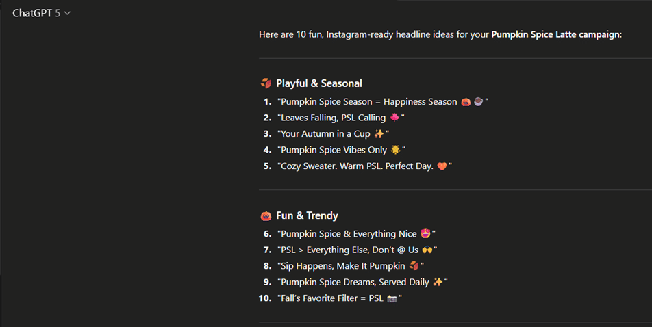 Приклад використання: Ланцюжок кави запитує Chatgpt на 10 цікавих, готових до Instagram заголовків для гарбузової кампанії Spice Latte.