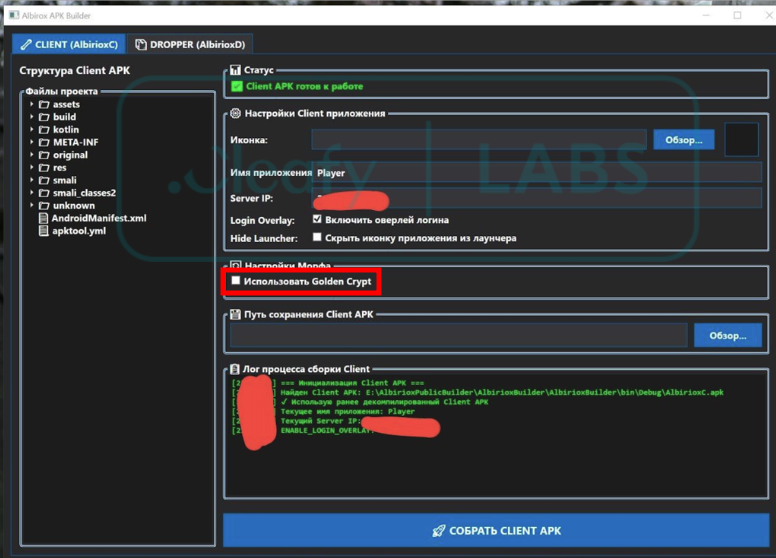 Потенційним клієнтам надається доступ до спеціального конструктора, який, як стверджують розробники, інтегрується зі сторонньою службою шифрування, відомою як Golden Crypt, щоб обійти антивірусні та мобільні рішення безпеки.