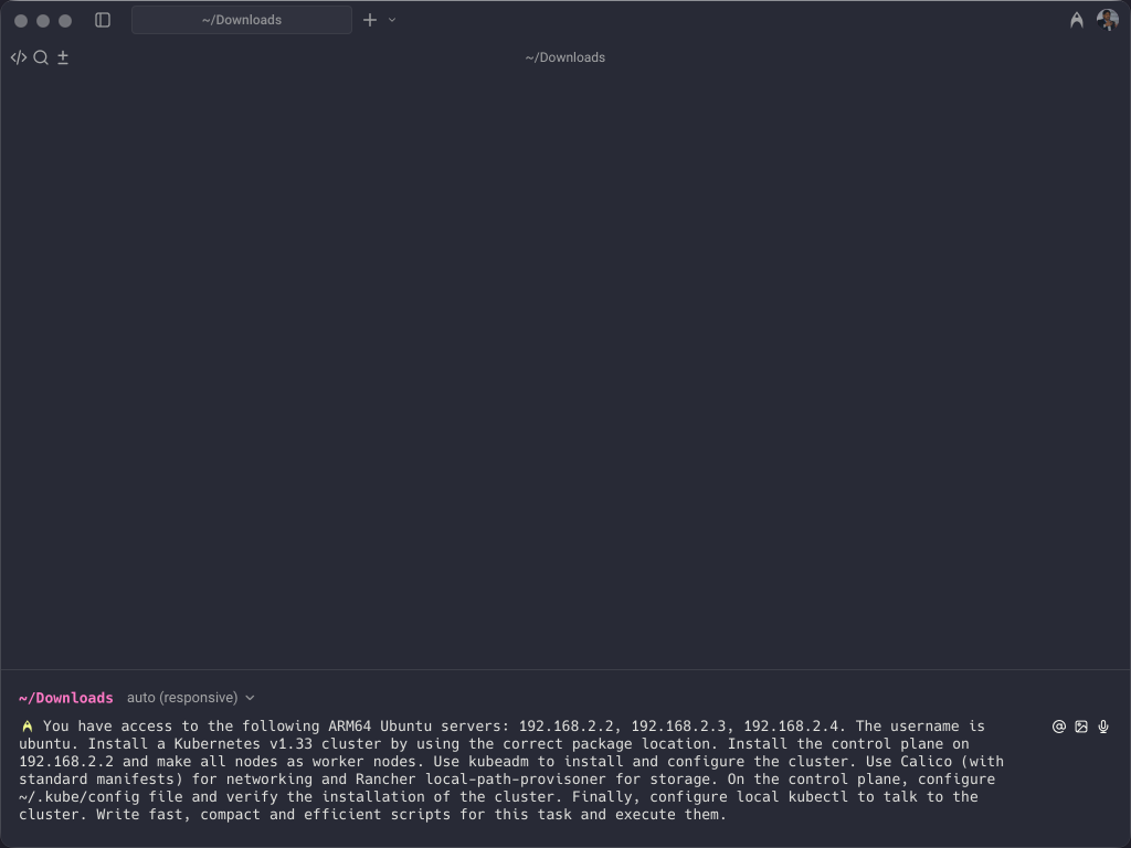 Щоб довести його ефективність для завдань адміністратора, я покажу вам, як інсталювати кластер Kubernetes 1.33 на набір віртуальних машин (ВМ) без виконання жодної команди. Ми скористаємося агентом Warp для налаштування кластера за допомогою комплексної та детальної підказки. Він не лише встановлює Kubernetes, але й налаштовує Calico для роботи в мережі та локального провайдера шляху для зберігання. Оскільки ми використовуємо той самий робочий процес, що й кодування Vibe, але для DevOps, я називаю цей підхід VibeOps.