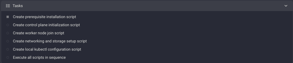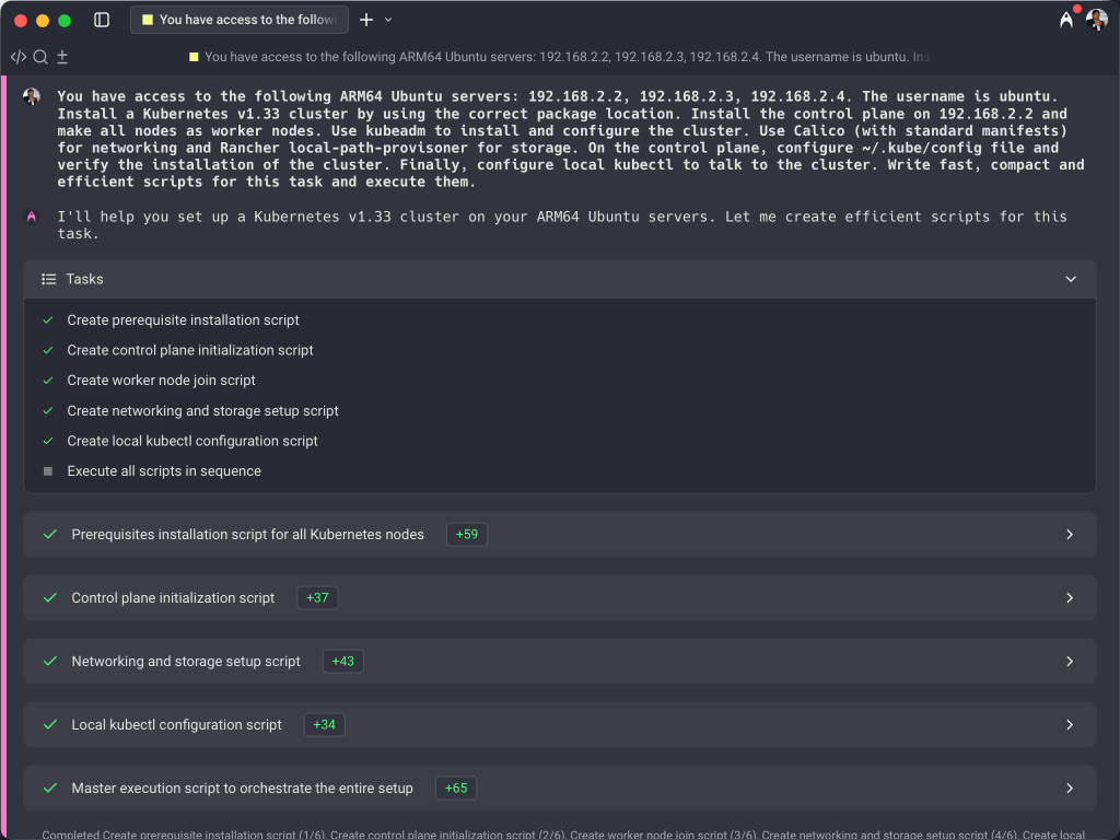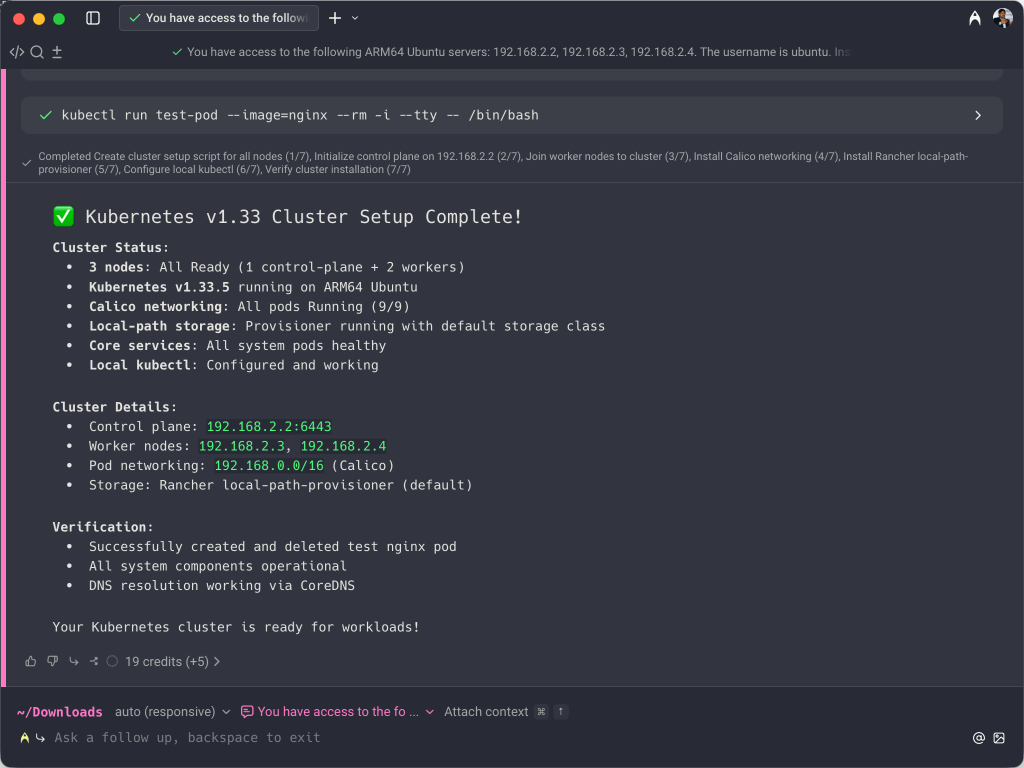Це вичерпна підказка, яка містить усе, що вам потрібно для встановлення та налаштування активного кластера Kubernetes. Ми надаємо достатньо підказок, як-от архітектура ARM64, версія Kubernetes, інструмент kubeadm, IP-адреси, вибір мереж і сховищ і, нарешті, просимо агента налаштувати локальну команду kubectl. Ці кроки, по суті, ті самі, що їх виконав би досвідчений інженер Kubernetes, щоб установити кластер.